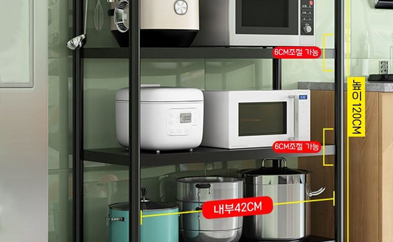 이 제품은 주방의 수납 공간을 깔끔하게 정리하는 데 도움을 주는 만능 선반입니다. 전자렌지, 밥솥, 그릇, 그외 주방용품 등 다양한 물건을 보관할 수 있어서 주방 내 적은 공간을 효율적으로 활용할 수 있습니다. 또한 4단으로 구성되어 있어 높이를 조절해서 사용할 수 있어 편리하답니다.